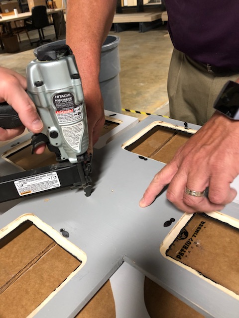 The small square piece of wood that was already attached to the backside of the top component (in Part II), is now attached to the bottom component using heavy duty staples or small finishing nails to complete the frame assembly. This piece of wood provides space between the two components to promote the 3-D look by making the top component appear to be floating over the bottom.
