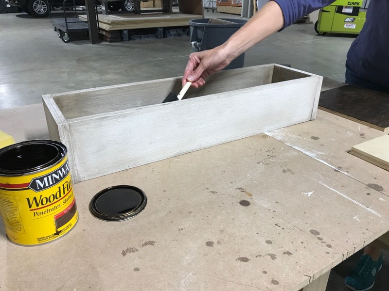 To complete our birch plywood flower box, we chose to give it an antique look.  A coat of white craft paint was applied both inside and outside of the box.  Once dry, a thin coat of dark stain was applied with a soft cloth and then immediately wiped off with a clean cloth.  This gives it a worn/weathered look.  After the stain was completely dry, the box was lightly sanded.  The sanding furthers the aging process and adds depth to achieve the desired antique appearance of the box.