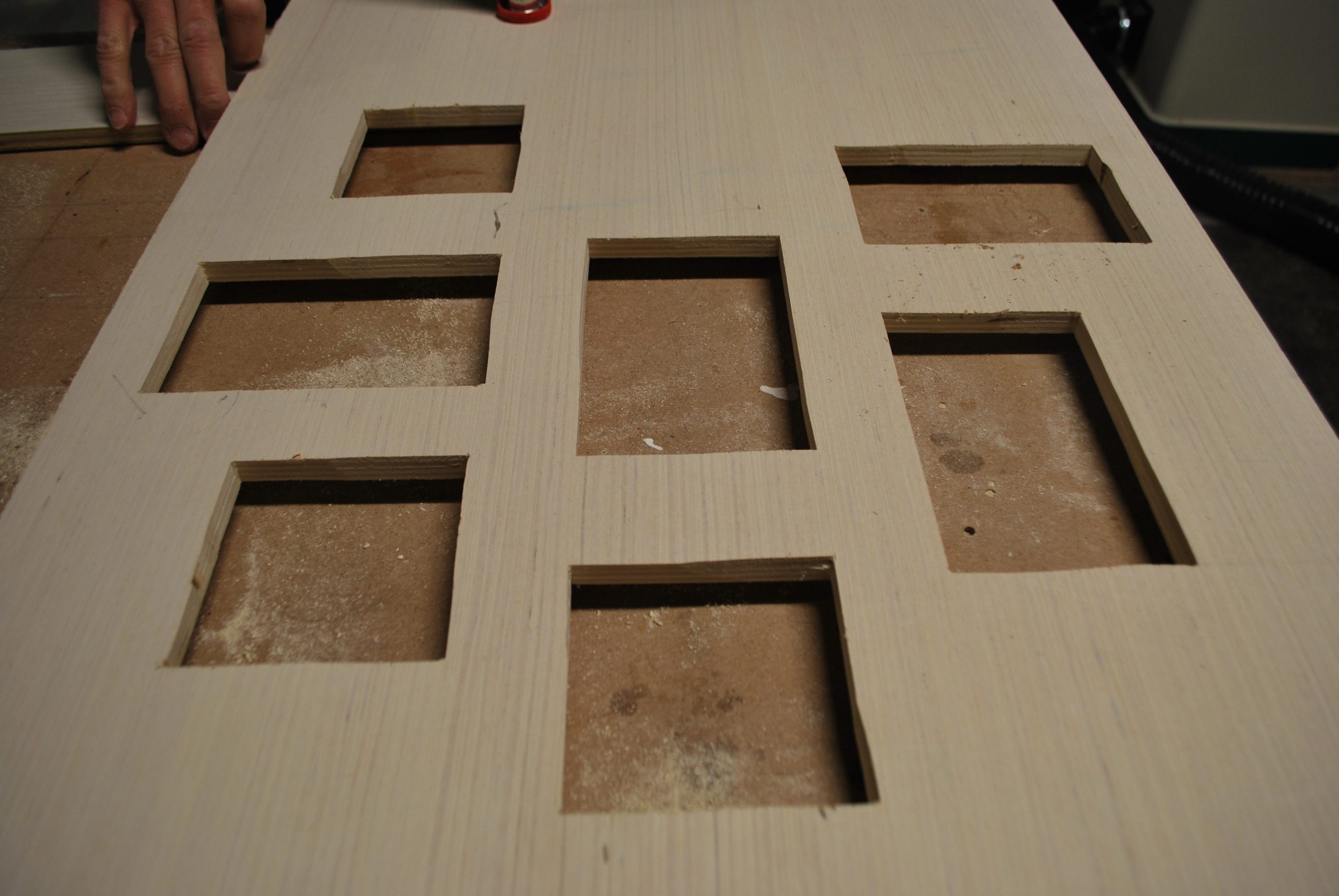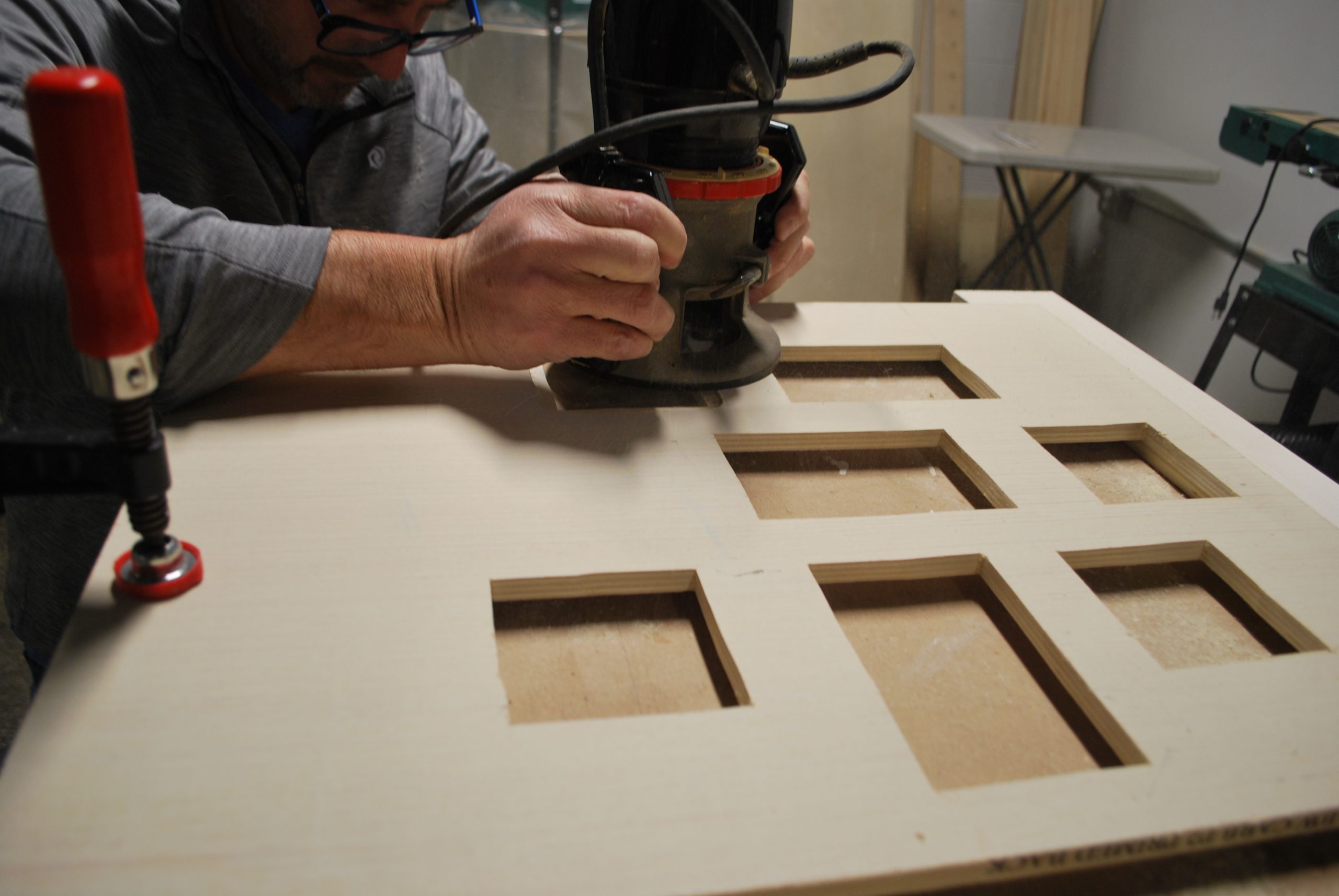 After carefully measuring and tracing the patterns for the needed cuts, a drill was used to outline the cuts as a guide for the jigsaw blade.  The edges of the cuts were lightly sanded to smooth the surface.  On the backside of the frame a router was used to trim a 1/2″ outline around each opening to create a compartment in order to place photographs and to nest backing ensuring a flat, neat surface.