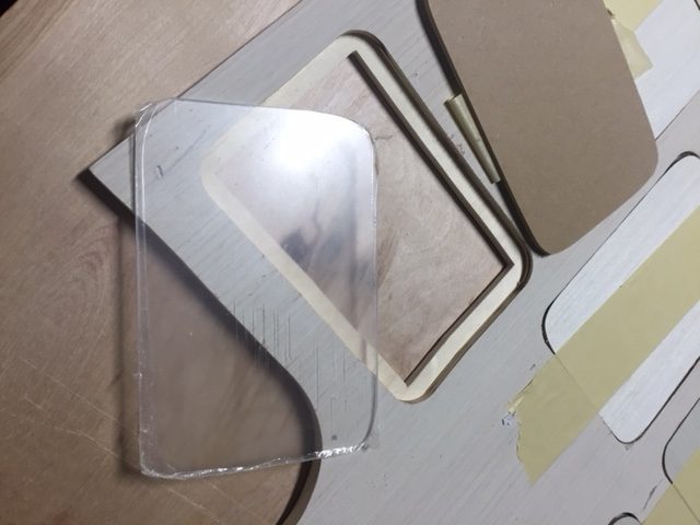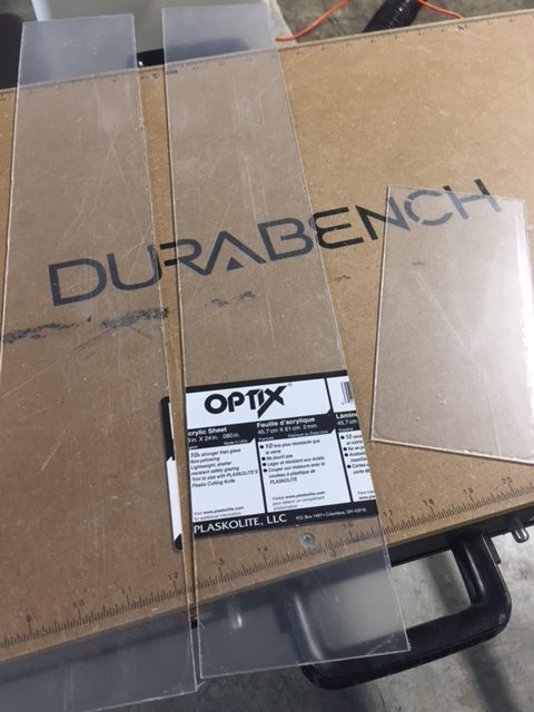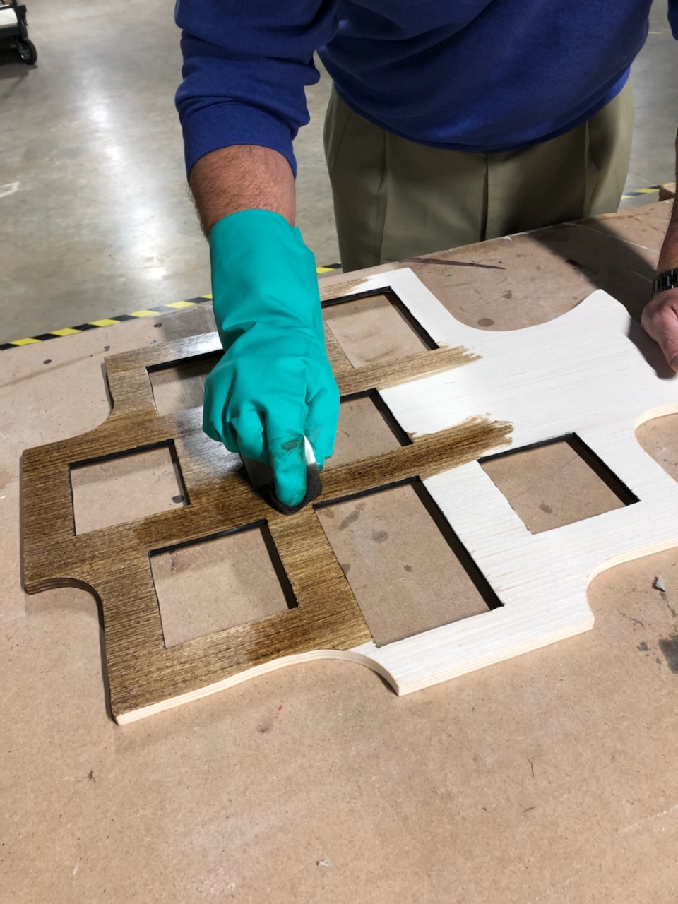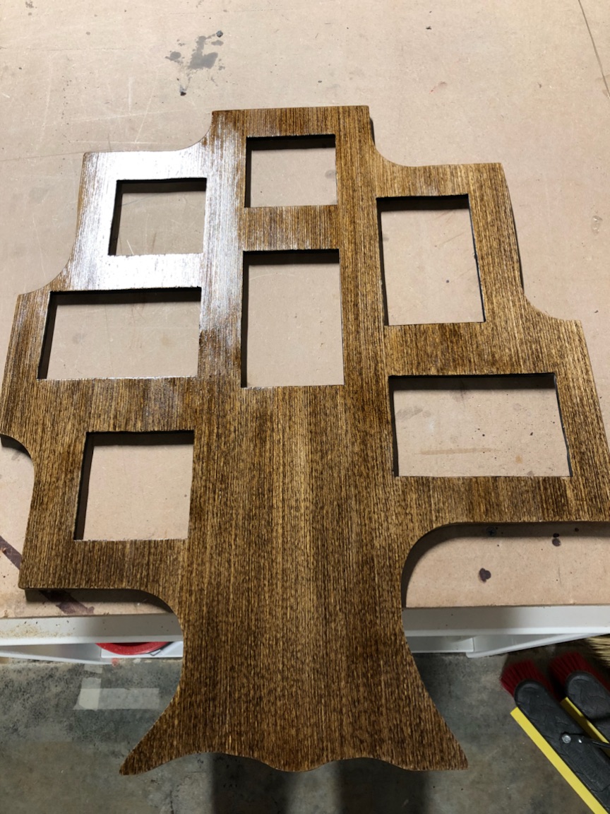 In continuation of the family tree collage frame, we are now ready to add paint or stain. We decided to use a dark wood stain for the front and a brown paint on the backside of our frame. While the frame was drying, pieces of acrylic were measured and cut to fit the openings for photos. RevolutionPly® was also cut for the openings as the backing to hold our photos in place.