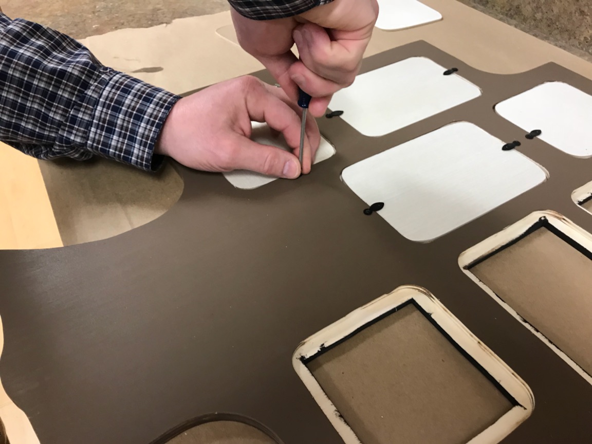 Once the frame dried, it was time to assemble our photos and to secure the backing with swivel fasteners. Two fasteners were installed on each photo opening to provide a snug fit.