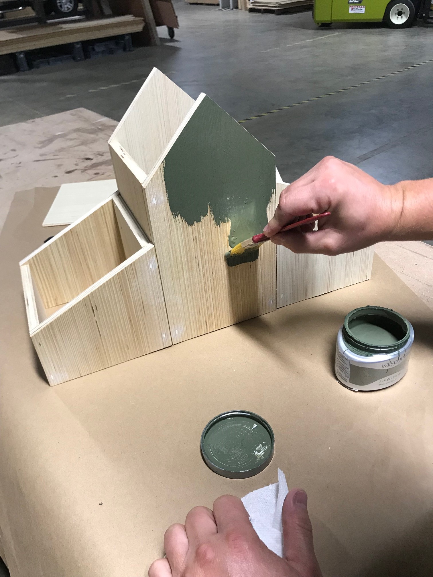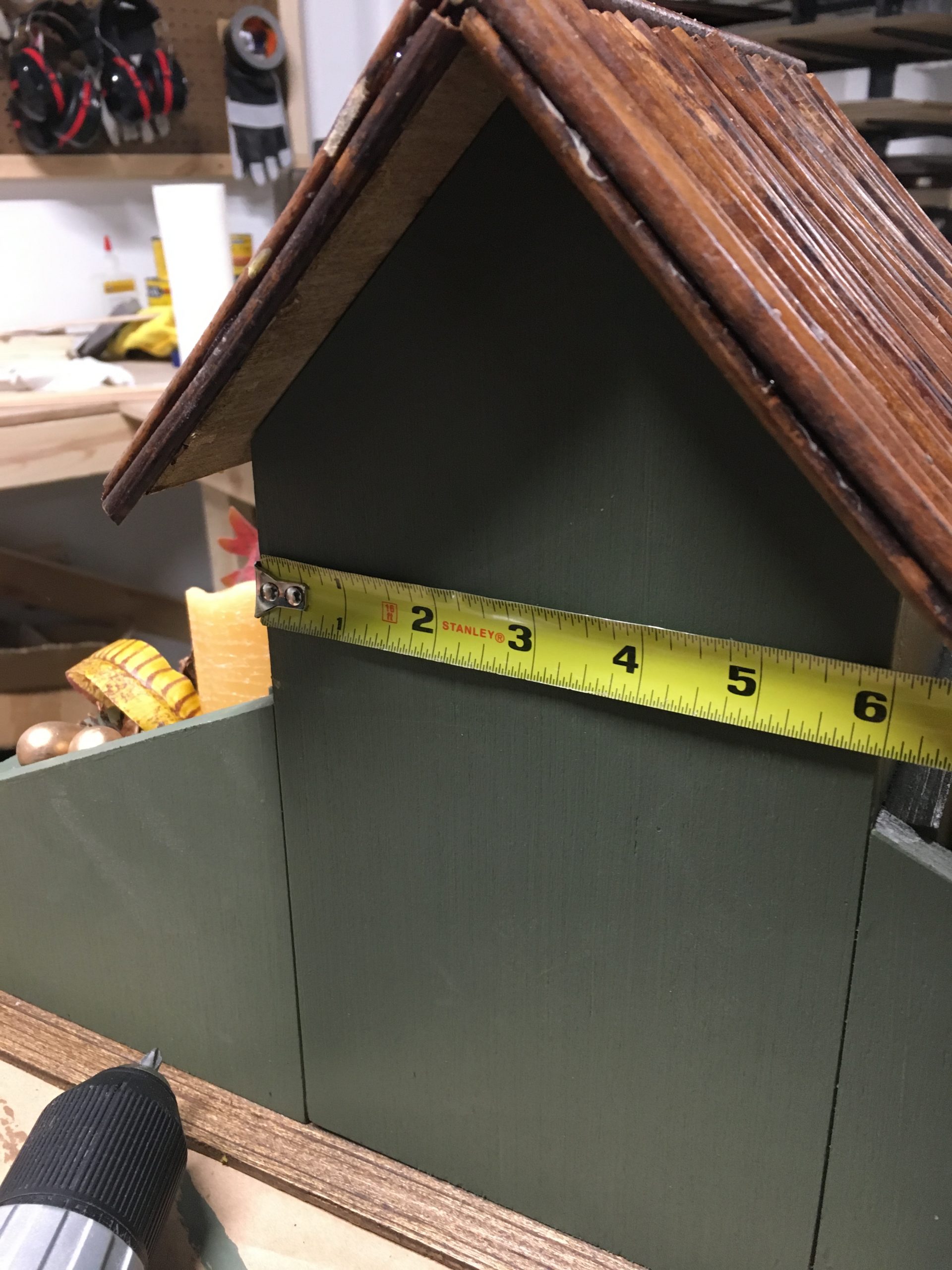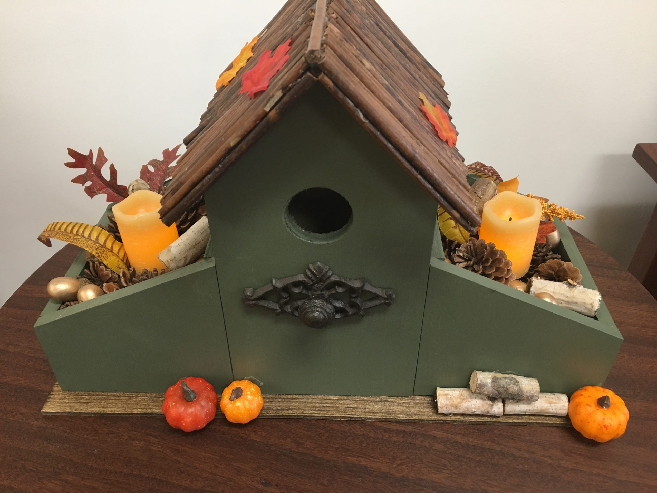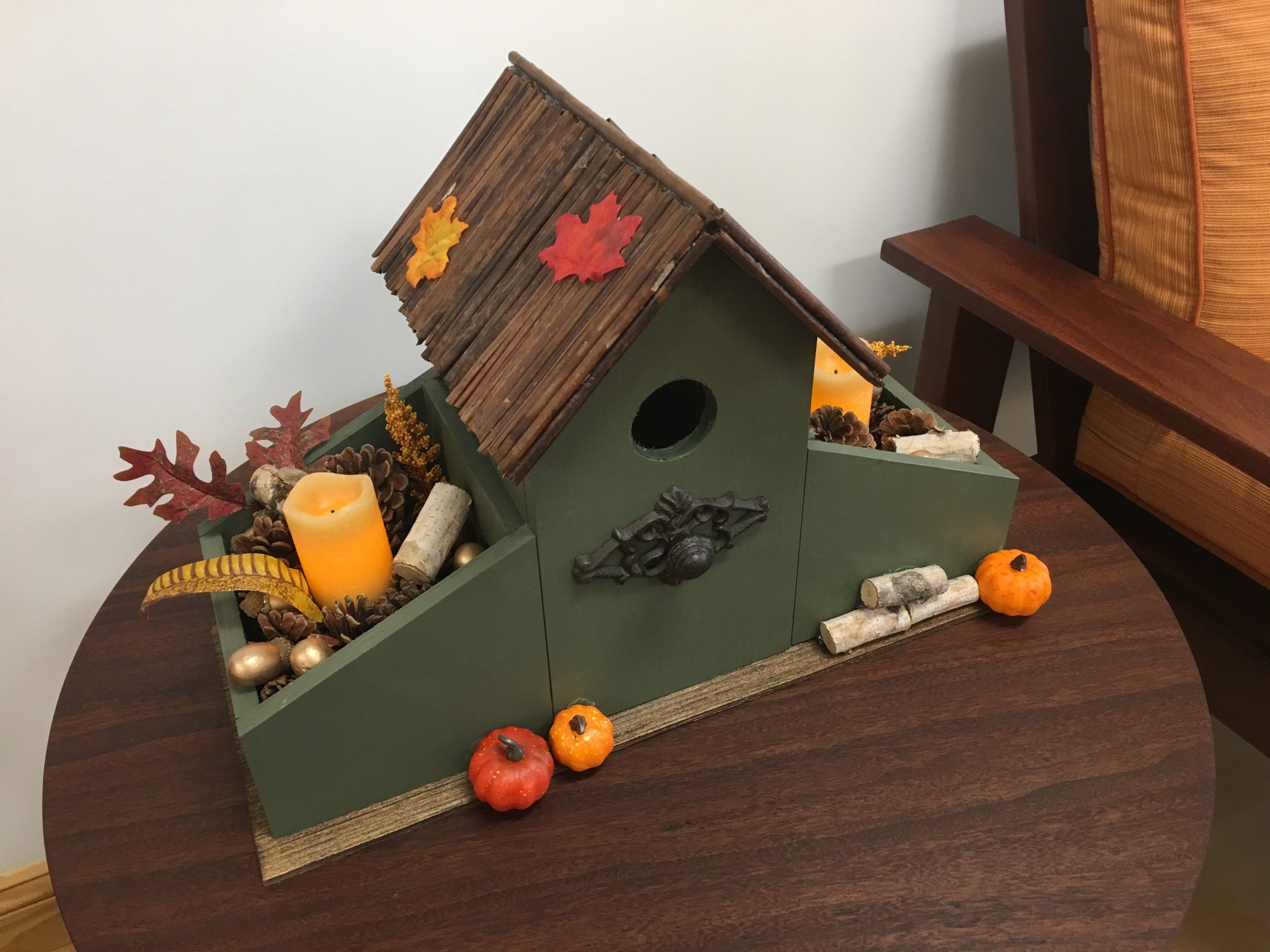 In decorating our first RevolutionPly® and RevBead® Reversible Plywood Beadboard birdhouse, we painted the birdhouse a dark green and the base and roof brown.  Sticks were cut and glued to the roof to give it an appearance of a thatch roof.  Then beautiful colors of fall were added with orange and red leaves, and pumpkins.  The side troughs of the birdhouse were filled with pinecones, acorns, leaves and flameless candles to add a touch of light.  These are all decorative items we purchased at a local craft store, and certainly there are a number of embellishments that can be used to achieve this autumn themed look.