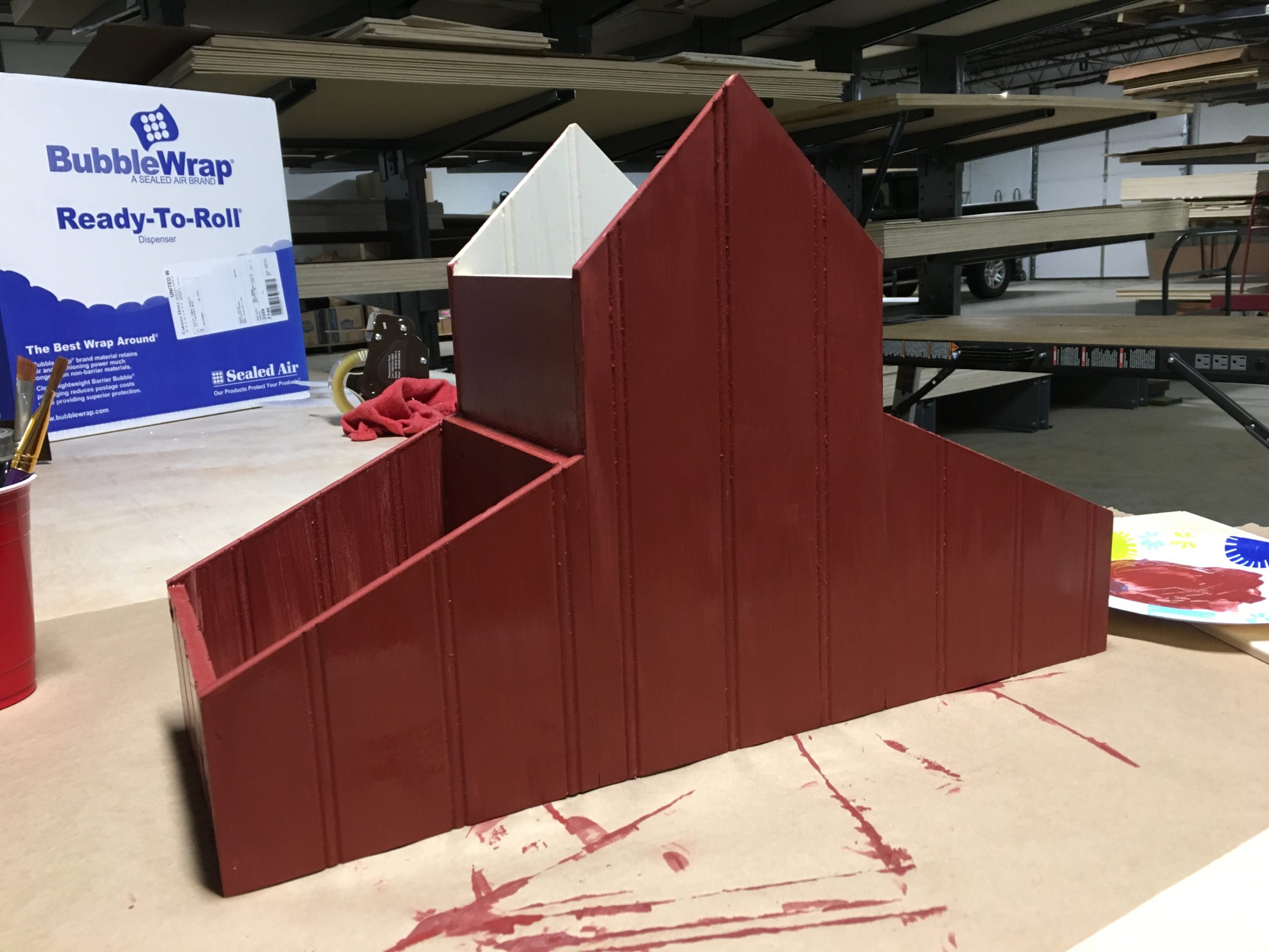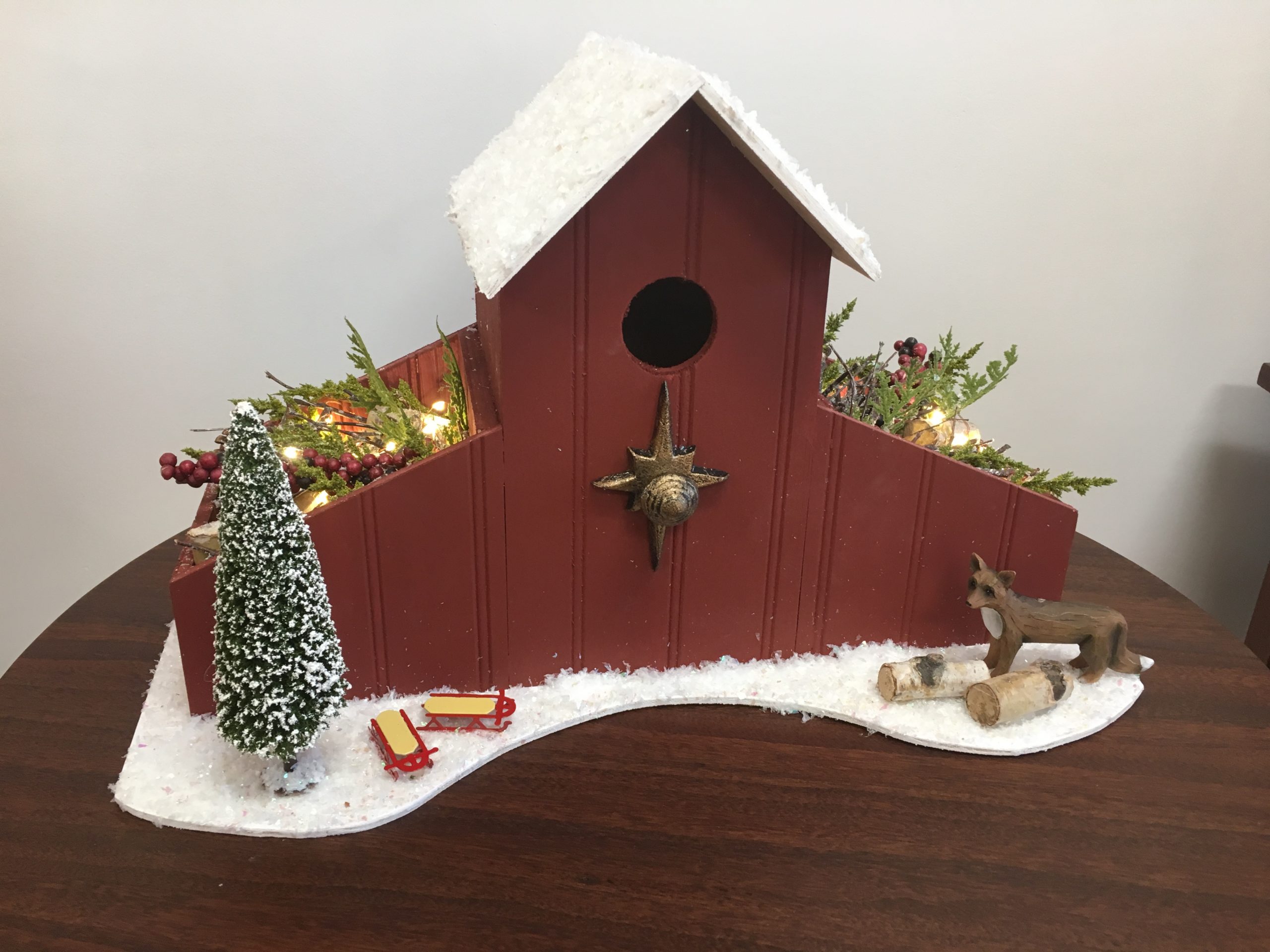 The second in the series of four RevolutionPly® and RevBead® Reversible Beadboard Plywood decorative birdhouses is being decorated in a winter theme.  We painted this birdhouse a deep red and covered the roof and ground with craft snow to create a wintry snow covered barn.  Other embellishments that were hot glued in place include a pair of sleds, a cedar tree, and a fox standing next to some firewood.  The side troughs were filled with twigs, firewood, greenery and red berries with a small string of soft white lights to illuminate the scene.