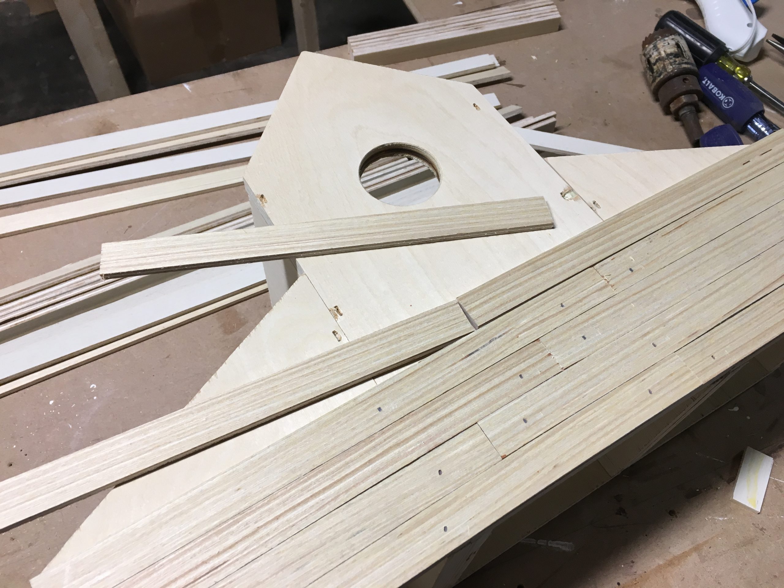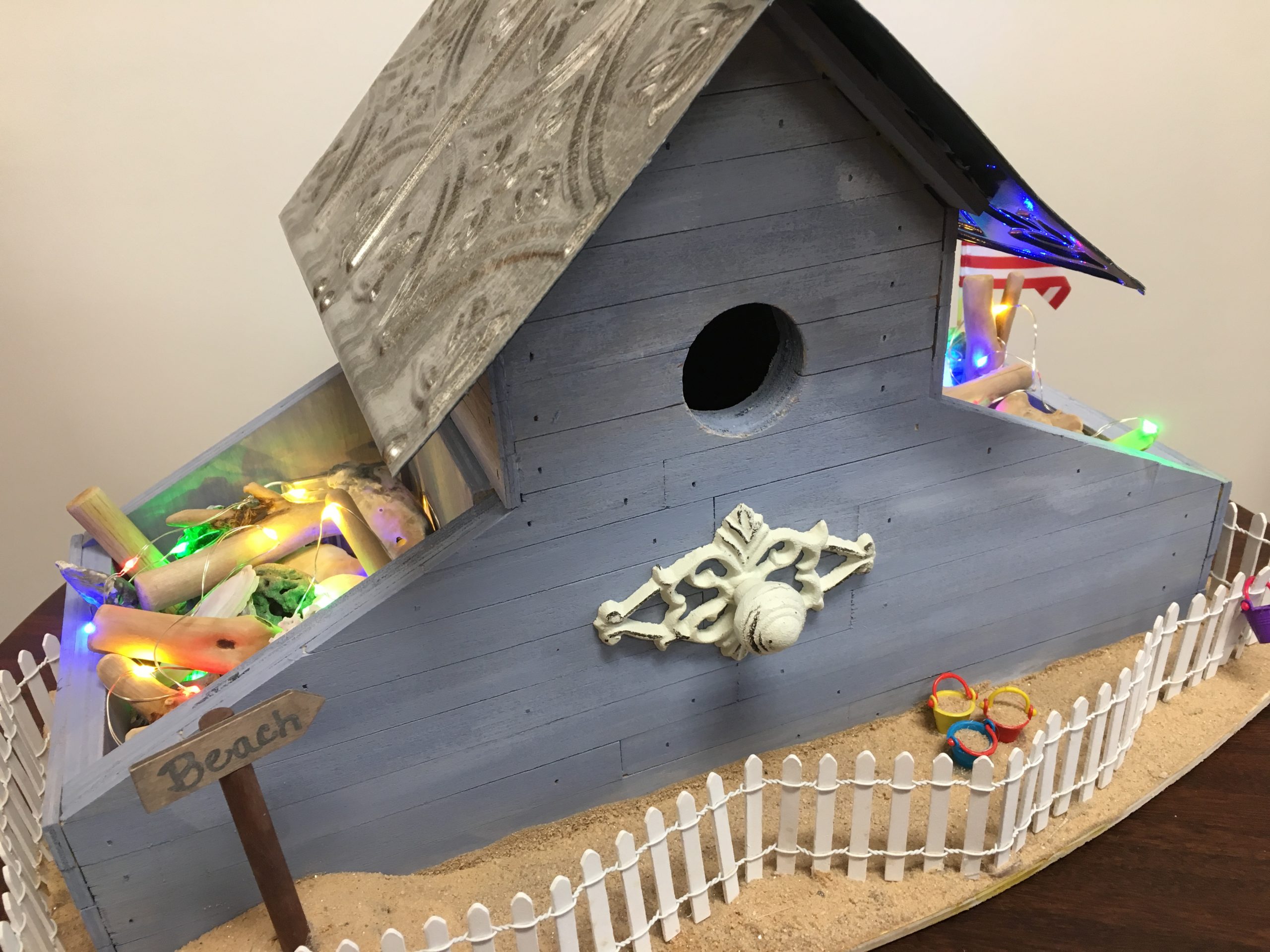The third in the series of four RevolutionPly® and RevBead® Reversible Plywood Beadboard decorative birdhouses is being decorated in a summer theme. Thin strips of wood were added horizontally as shiplap siding to give the birdhouse a beach cottage look. We then painted it a light blue and added a tin roof and antique decorative knob. Embellishments include a picket fence and other beach-style decorations, such as sand pails, driftwood, seashells, and a beach sign.