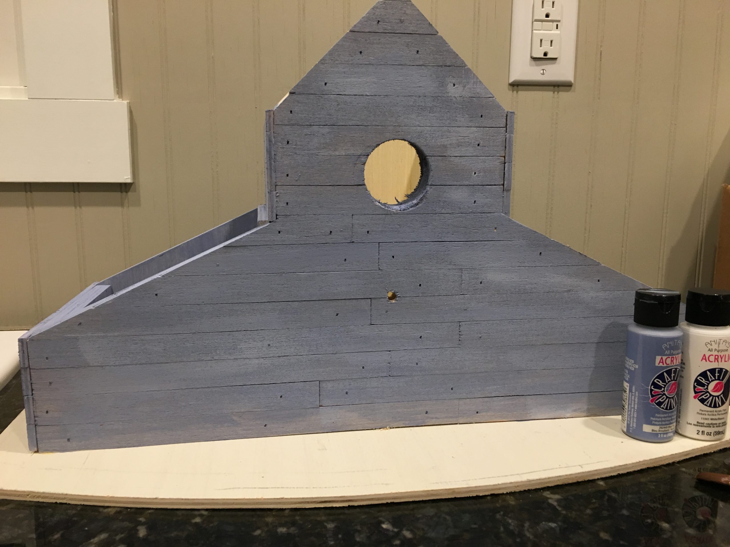 The third in the series of four RevolutionPly® and RevBead® Reversible Plywood Beadboard decorative birdhouses is being decorated in a summer theme. Thin strips of wood were added horizontally as shiplap siding to give the birdhouse a beach cottage look. We then painted it a light blue and added a tin roof and antique decorative knob. Embellishments include a picket fence and other beach-style decorations, such as sand pails, driftwood, seashells, and a beach sign.