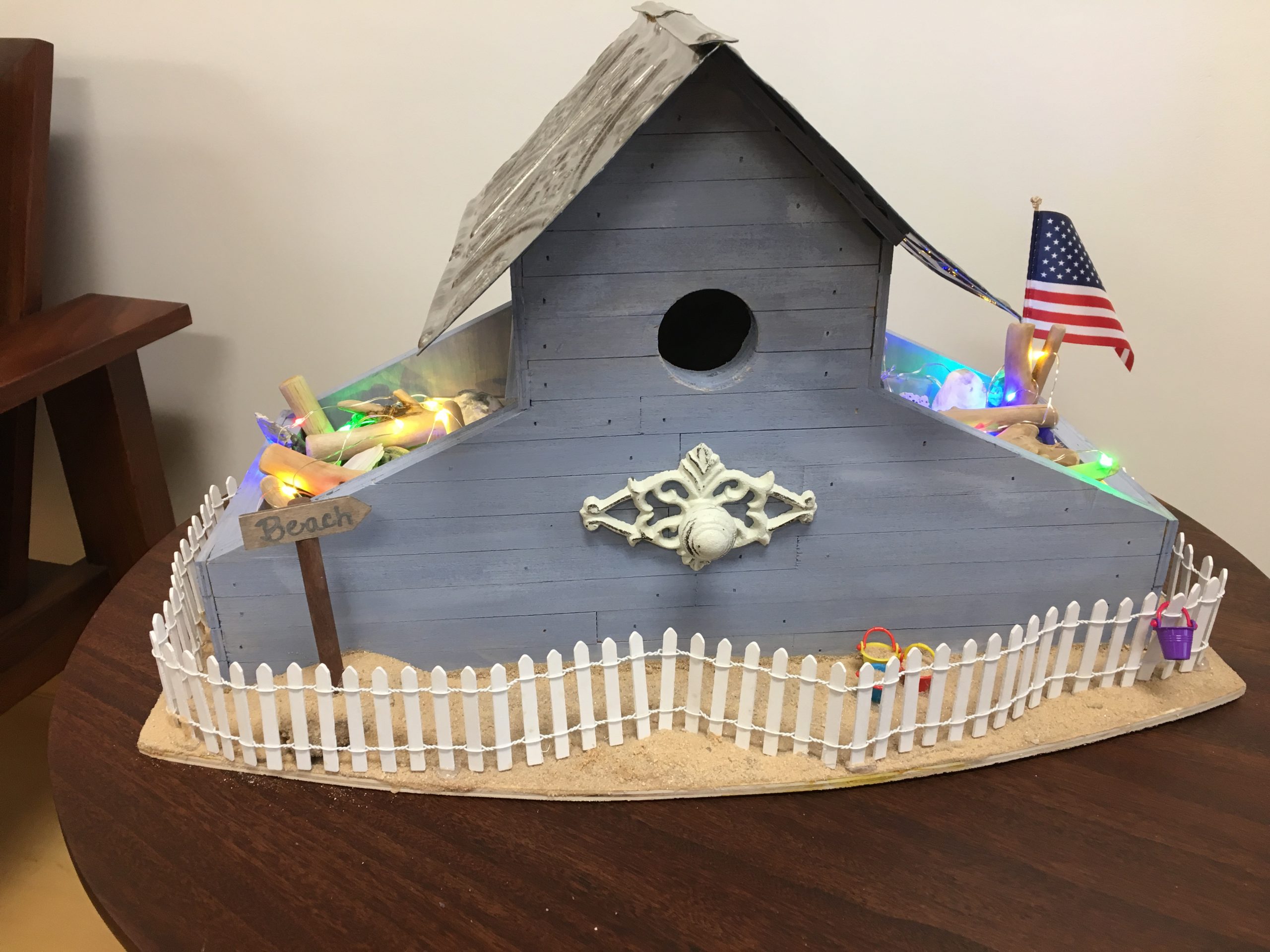 The third in the series of four RevolutionPly® and RevBead® Reversible Plywood Beadboard decorative birdhouses is being decorated in a summer theme.  Thin strips of wood were added horizontally as shiplap siding to give the birdhouse a beach cottage look.  We then painted it a light blue and added a tin roof and antique decorative knob. Embellishments include a picket fence and other beach-style decorations, such as sand pails, driftwood, seashells, and a beach sign.
